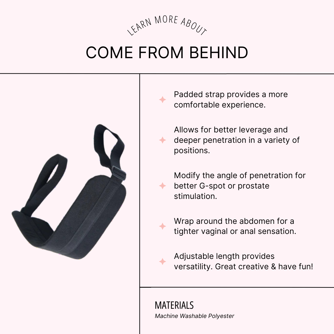 Dog-tired of doggie-style? Liven up your bedroom or delve into your deepest desires with Come From Behind. This position strap features a cushioned pad, two looped handles, and an adjustable length so it can fit just about anyone. Specially designed to enhance doggie-style, Come From Behind allows for more pleasurable angles, deeper penetration, and better orgasms. Just wrap the padding around the front partner's waist, while the back partner slides their hands through the loops and grasps the strap. This will give the front partner full support, and the back partner full control.